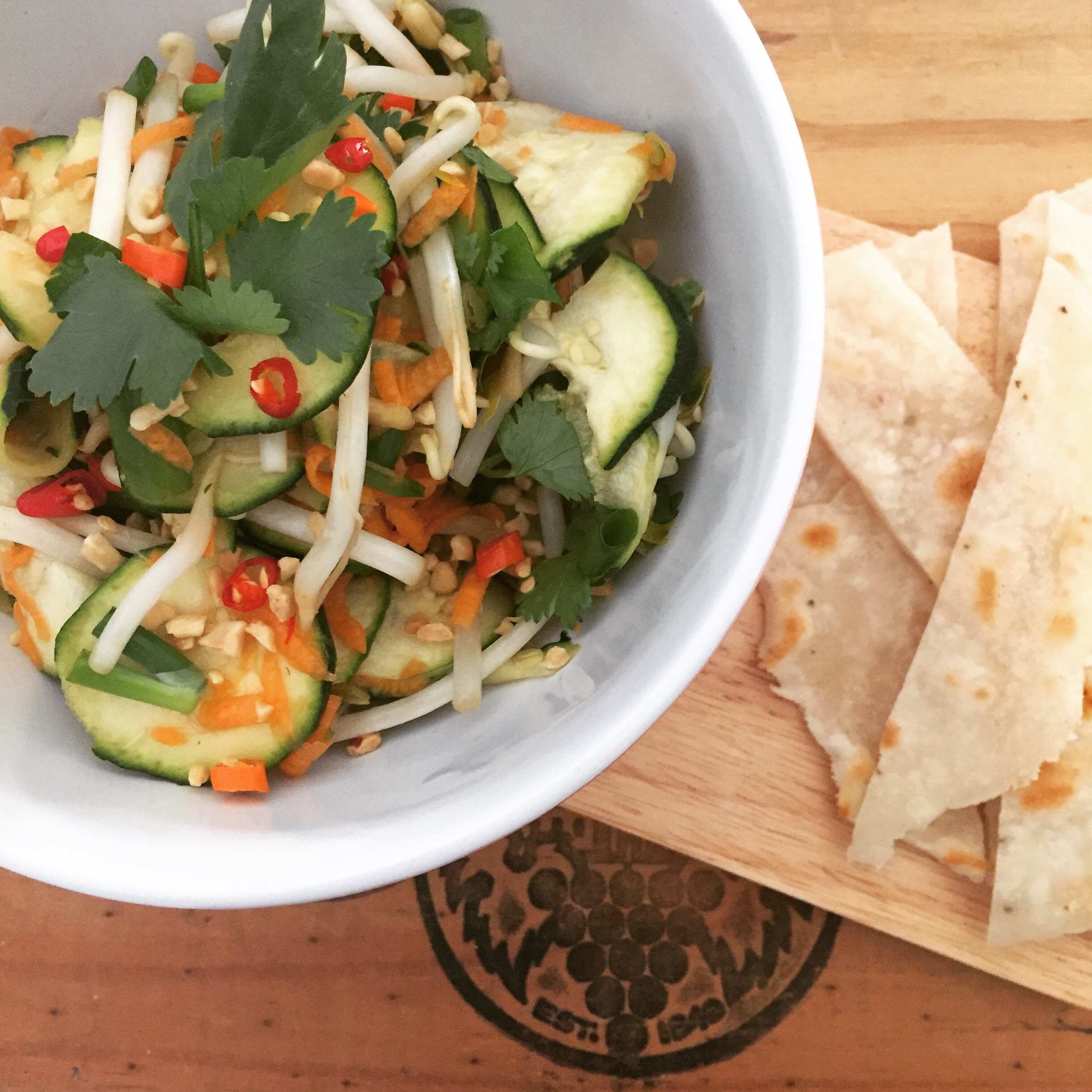 I cut all of the salad ingredients and tossed them in a large bowl. Combined all of the dressing ingredients in a jar and shook like crazy. I would recommend serving up each bowl of salad separately and then pouring on the dressing. This way, if there’s extra salad it stays fresh until you need it. I then sprinkled some crushed peanuts, placed some sliced chillies and extra coriander on top. I used fiery chillies from my garden and they packed a punch. I served my salad with some homemade flat bread which is really easy to make.