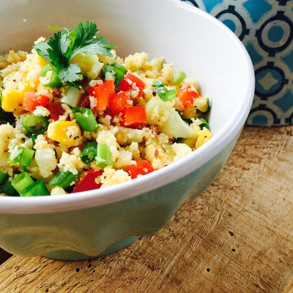 Chop cauliflower up and blend in blender until it breaks up. Put cauliflower in baking dish and add oil and a sprinkle on cumin, chilli and garlic. (it’s up to you how much) Cook for approximately 30 minutes on 180 degrees. Stir every 5 to 10 minutes. Once cauliflower is cooked add chopped spring onions, capsicum, corn and coriander and mix all together.