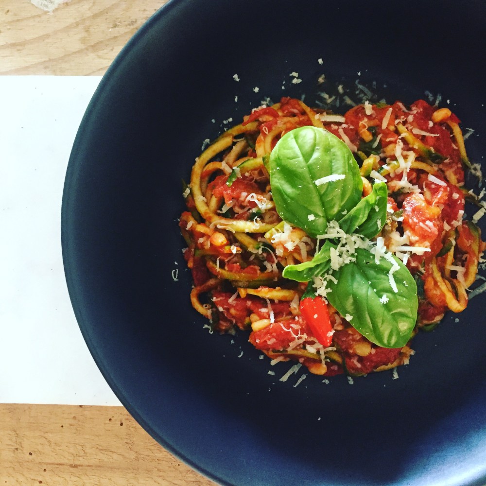 Cook olive oil, pine nuts, tomatoes, basil and chilli over a low heat. Mix in zucchini and serve with shaved parmesan.